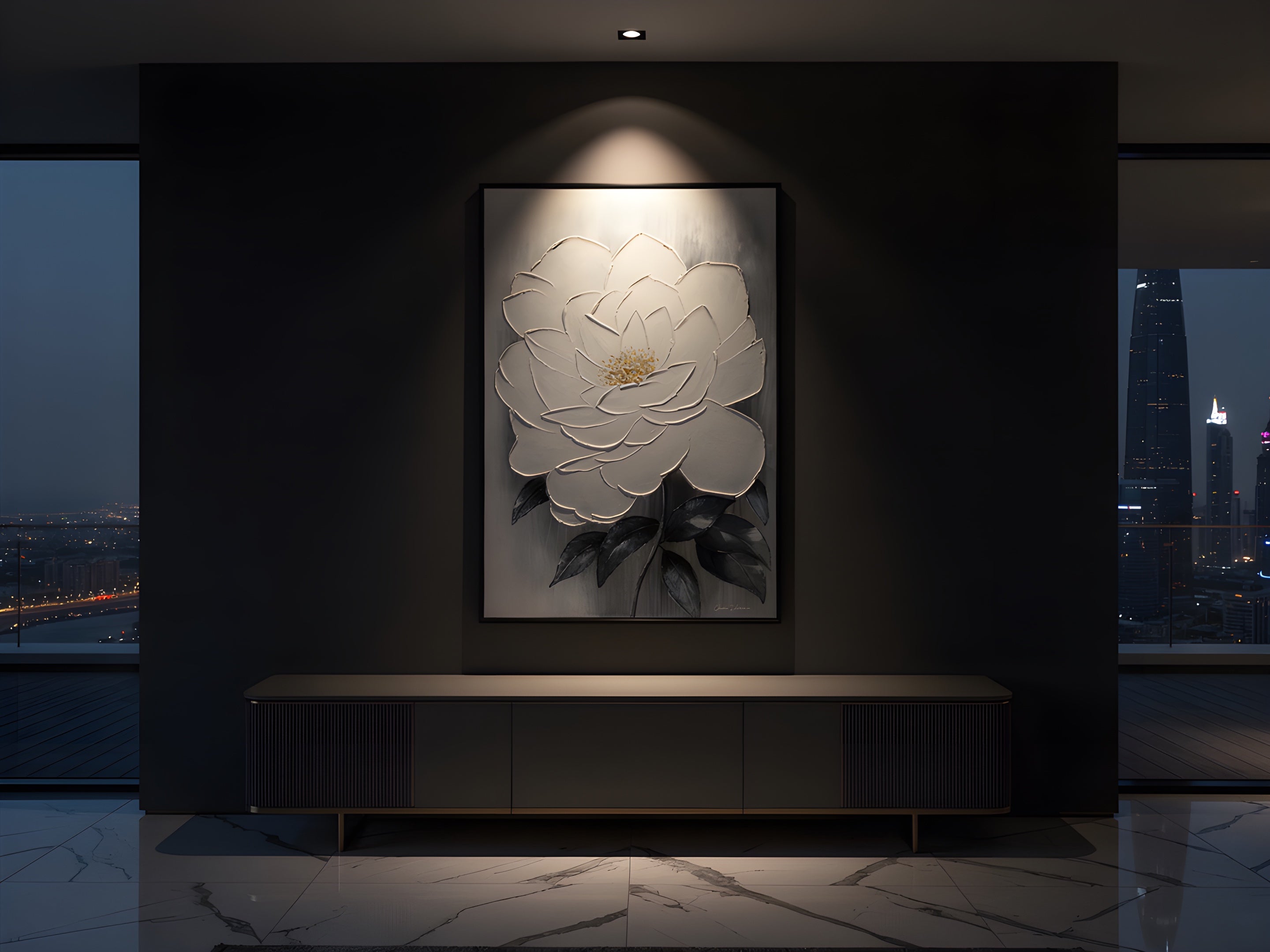 Candore presents a single white bloom in monumental scale. Dimensional petals rise from soft grey mist, catching light across textured ridges of hand-applied pigment. Touches of gold anchor the composition in restrained opulence. Hand printed and painted, never repeated. For collectors who understand that true luxury lies in singularity.